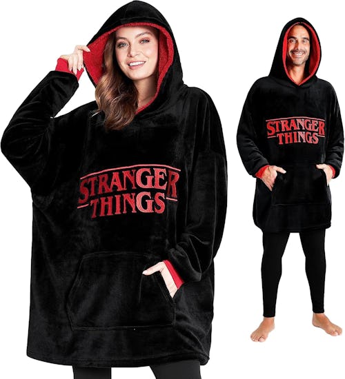 The Stranger Things Blanket Hoodie is the ultimate cozy companion for fans of the show. With its oversized, sherpa-lined design, this hoodie provides all the comfort of a cozy blanket while letting you channel your inner Eleven. It features a soft polyester fabric, a spacious hood, and a kangaroo pocket, making it a practical choice for chilly days or marathon viewing sessions. Measuring at 75.59 x 35.43 inches, it's a versatile fit for most, and the easy-care material ensures it remains soft and warm over time.