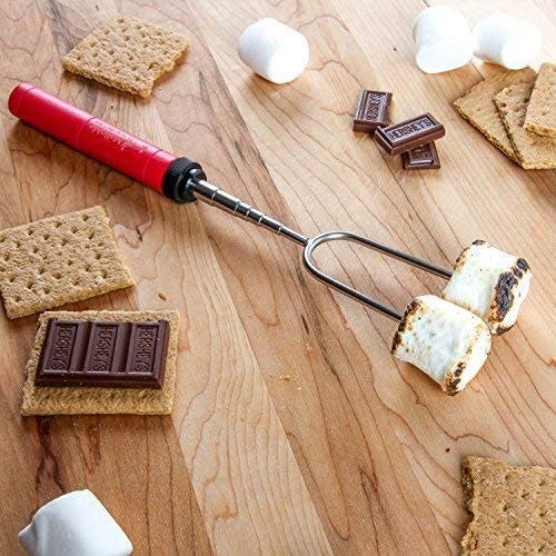 These marshmallow roasting sticks are amazing because they start off at 10 inches long — great for easily storing between camping trips — and then extend up to 34 inches to keep your hands, fingers, and face safe when you’re ready to use them. They have two stainless steel prongs with rounded tips and the handle has a notch that allows you to rotate the sticks for evenly toasted treats.