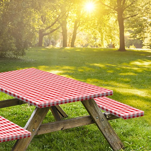 This easy-to-wipe tablecloth that perfectly fits a picnic table & benches