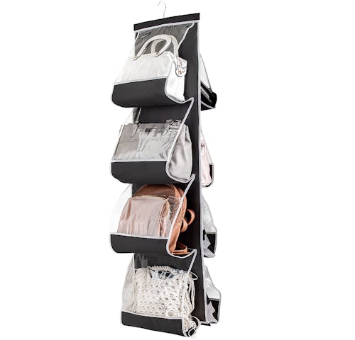 This hanging organizer will keep eight handbags free of dust and damage. The hook at the top swivels 360 degrees for easy access to all eight slots. Reviewers also use them to hold rolled towels, paper towels, and more in various closets around the house.