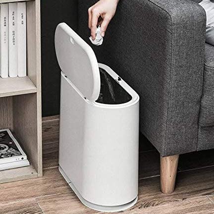 Available in white or black, this modern-looking trash can has a slim design that allows it to fit perfectly in tight spaces, whether it’s in the bathroom, the living room, or under a desk. But the real draw is its push-button lid that keeps trash concealed. As a bonus, it has a removable divider that allows you to split it into two compartments.