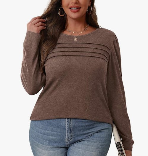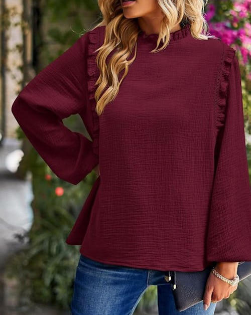 If you love ruffles but prefer an understated look, try this long-sleeved crewneck blouse. Its lightweight material is great for any season, and elastic wrists hold its sleeves in place. Layer your favorite necklaces over its chic collar. With its textured fabric, you’ll look classic and refined, but never boring.