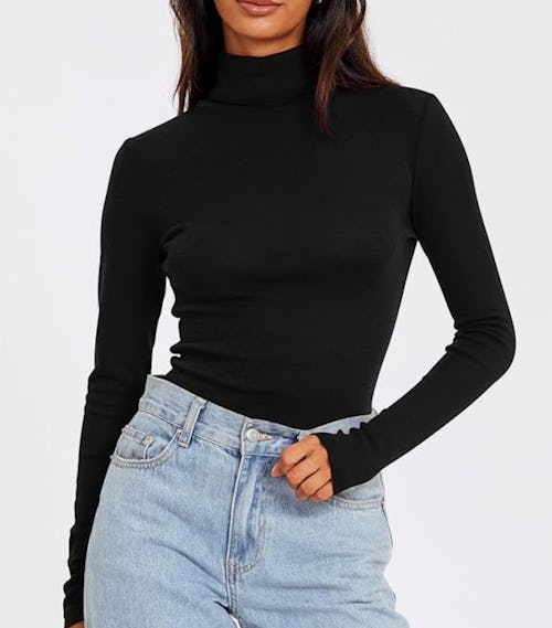 Whether the seasons are changing or you just don’t know what to wear, throw on this long-sleeved turtleneck. With its slim fit and versatile design, it looks great under jackets, sweaters, or on its own. Its stretchy rayon/spandex fabric blend keeps you comfortable all day. You can also pair it with black tights and a mini skirt for a classic party look.
