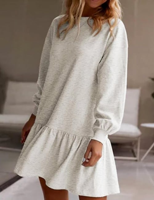 This long-sleeved sweatshirt dress keeps you both stylish and warm. Its delicate tiered design is so dreamy, you’ll want to wear it year-round. Classic details like a crewneck and long sleeves ensure it’ll never go out of style. Plus, it makes getting dressed in the morning so easy — simply slip it on and go.