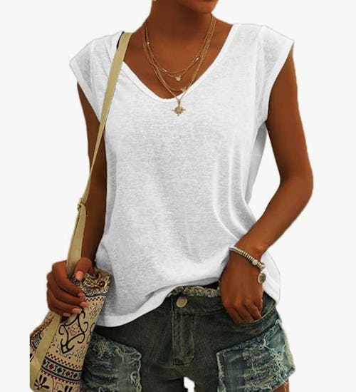 Give the classic “jeans and a T-shirt” style an update with this cap sleeve V-neck tee. Its cotton blend fabric is heathered for a trendy vibe, and its mid-length looks great with low and high-waisted jeans alike. You’ll also appreciate its cute cap sleeves, which add a youthful energy.