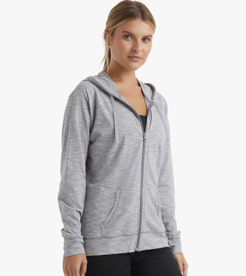 This heathered zip up hoodie is a sporty staple in any gym buff’s closet. Its 100% cotton jersey fabric has a textured look, which adds personality to any outfit. You’ll also appreciate details like an adjustable hood, side pockets, and a tag-free neckline. Throw it on over a sports bra and leggings for your next sweat session.