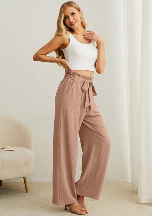 Slip into something a little more comfortable: these high-waisted palazzo pants. With their drawstring waist, you can move and breathe as much as you need. Their lightweight material means you won’t overheat, and their pockets add a functional touch. Style them with sneakers, sandals, or heels; their length covers your legs but shows off your shoes.