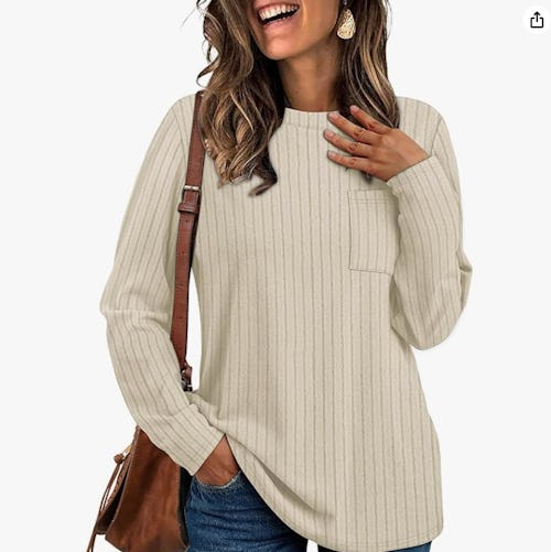 One Reviewer Wrote: “The lightweight material makes it perfect for layering, and the crew neck gives it a classic look. I love the casual tunic length, which pairs nicely with leggings or jeans, and the added pocket is a cute and functional detail. It's a comfortable, stylish piece that I can wear throughout the day, whether I’m running errands or just relaxing at home.” — Echi