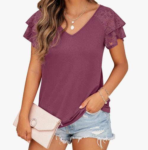 You’re sure to fall in love with the lace detailing of this ruffle sleeve V-neck tee. Its short ruffled sleeves put a dreamy twist on a classic style. Made of a super soft high quality rayon blend fabric, it's wearable all day long, and you can dress it up or down. With its medium length, it's easy to tuck in or leave loose. Its fitted design offers a close fit while still offering up some room to move.