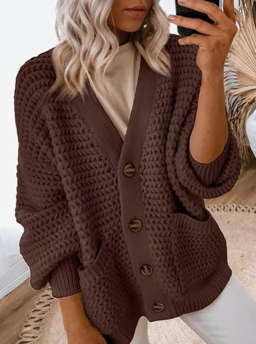 Pair this chunky knit cardigan with a crop top and a cozy scarf. Its soft knit material keeps you warm without overheating. Tortoiseshell buttons add a timeless touch, and ribbed cuffs are great for rolled-up sleeves. Best of all, it’s machine washable for a convenient clean on laundry day.