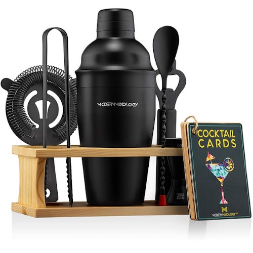 Complete your home bar or boost your mixology game with this eight-piece bartender set. It comes with a cocktail shaker, a bar spoon, a bottle opener, a double jigger, a strainer, and ice tongs, all of which are made from matte-black stainless steel and store inside the wooden stand. You even get a recipe booklet of 20 cocktail cards.