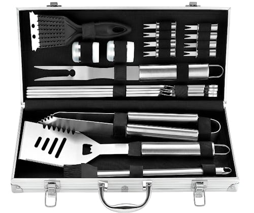 Avid grillers and campers said that this grill tools set was their “best purchase of the year.” It includes a spatula, tongs, fork, a basting brush, grill brush, salt and pepper shakers, eight corn holders, and four skewers, all made from stainless steel and well-organized in an aluminum case.