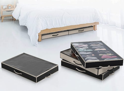 Make good use of the space underneath your bed with these sturdy shoe storage boxes. They’re designed to hold up to 16 pairs of regular shoes and four pairs of boots, but you can use them for other storage needs as well. The plastic top allows you to easily see what you’re looking for, while handles on the sides make it a breeze to pull them out from under the bed.