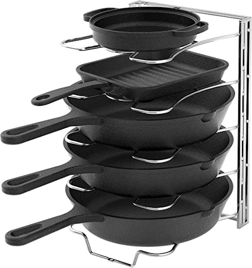 Clunky and sometimes heavy, pots and pans can take up a lot of space in your cabinets — and they can easily turn into a teetering pile constantly threatening to fall over. This organizer rack is an ideal storage solution, with the space to hold up to five pots, pans, and lids, or even cutting boards and sheet pans. It’s adjustable to fit your needs and comes in chrome, bronze, or silver.
