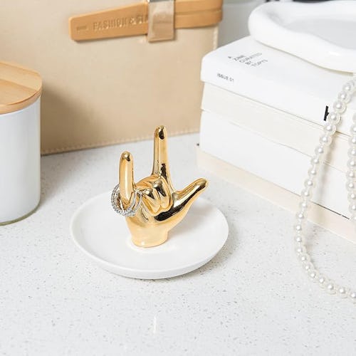 A jewelry holder like this one is great to have in your bedroom or bathroom to store your rings, bracelets, and more, keeping them safe and in one place. It also features a hand making the “I love you” sign, so it’s especially great as an engagement ring holder gift. It’s made of heavy-duty ceramic and is available in a gold, white, or silver finish.