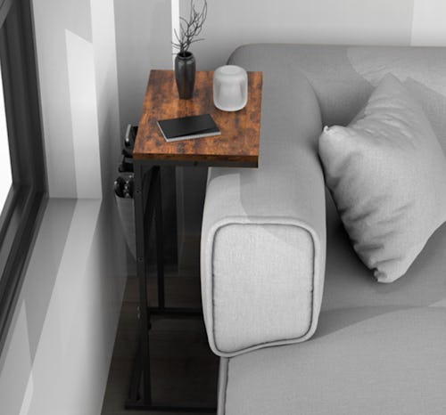 Especially ideal for small spaces, this sleek end table features a convenient C-shaped design that makes it fit neatly over the arm of almost any couch. The table comes in four finishes and has a storage pouch with pockets to hold small items like remote controls and tablets. The table can hold up to 22 pounds, has height-adjustable feet, and is lightweight for portability.