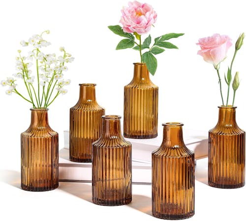 Perfect for adorning dining tables or any surface that could use a little decor, these flower bud vases lend a classic vintage look to your home. They come in a set of six and are all made of amber glass with a stylish ribbed texture. Use them to showcase gorgeous flower stems and minimalist plants or as an ideal holder for aromatherapy sticks.