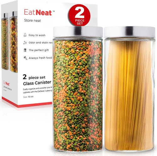 Keep pantry staples fresh for as long as possible with these popular glass food storage containers. They come in a set of two in a long, 72-ounce design and include stainless steel lids that provide an airtight seal. Their clear finish lets you easily see the contents and their wide mouth makes them a cinch to clean.