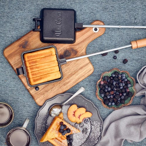 Great for campfires, this sandwich maker is designed with pre-seasoned, nonstick cast iron square heads. It includes two removable handles that also extend to keep your hands away from open flames. It has grilled grids to enhance flavor and a sturdy clip to keep it shut. It can also be used to make hand pies.