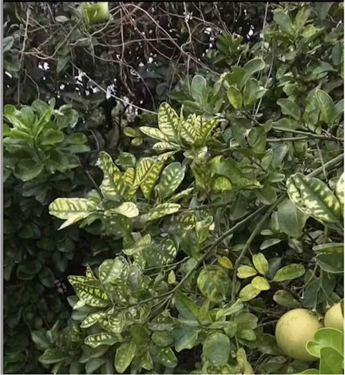 Infected trees produce fewer fruit. The fruit that does grow is partially green, smaller, shaped irregularly, and bitter-tasting. It may drop from the trees before ripening. Leaves may show blotchy mottling.