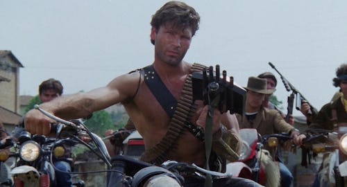 In the four-year gap between Mad Max 2 and Beyond Thunderdome, not one, but two post-apocalyptic actioners clearly indebted to Australia’s most famous road warrior were released. They were both made by Italian exploitation maestro Joe D’Amato, who was never one to miss out on an opportunity to rip off a successful hit. Indeed, just six months after transforming the Big Apple into a nuclear wasteland in Endgame, the man of many pseudonyms envisioned a future where the Lone Star State was overrun by maniacal thugs dressed like they’d just wandered out from a BDSM club. That movie would go by the title 2020 Texas Gladiators.