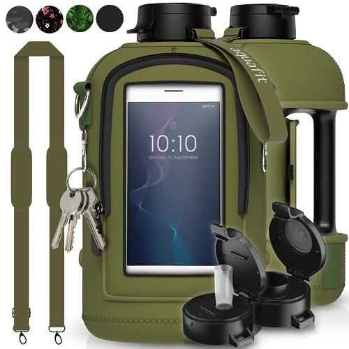 AQUAFIT 64 oz Water Bottle with Time Marker PLUS Carrying Sleeve with Strap - Water Bottle with Strap - Water Bottle with Straw - BPA Free Gym Water Bottle - Big Water Bottle with Handle (Olive)