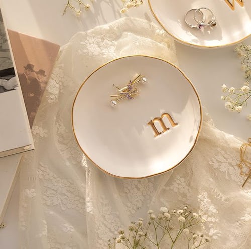 A jewelry tray that’s personalized with a monogrammed letter