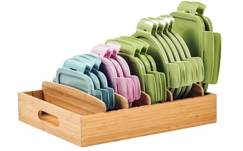 This cabinet organizer can be used for just about anything that you can think of. Neatly line up your hand towels in your bathroom, separate your cooking ingredients using the removable dividers, or pile in your lids so that they are easy to find and don’t end up in a messy pile. It’s made of premium bamboo and has anti-skid silicone feet to keep it in place.