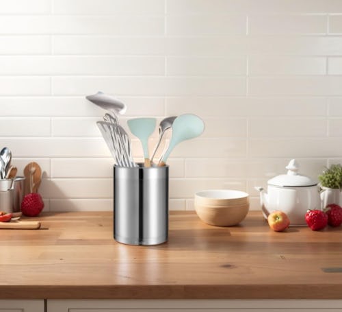 This stainless steel utensil holder won’t tip over thanks to its weighted bottom. One reviewer wrote, “Super shiny, tough, made very well, has weight to the bottom, holds ALL my utensils like I wanted, AND needed and looks expensive.”