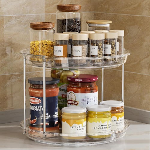 This two-tier turntable maximizes cabinet space and both sections have a raised edge so that nothing tips over. One reviewer wrote, “They stay in place very well; my three cats have yet to knock one over. Great use for the cost.”