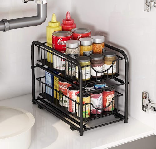 Declutter in a cabinet or under a sink with this cabinet organizer. Its two pull-out drawers make it easy to grab everything from cleaning supplies to cooking oils. The height of its top tier can also be lifted to make room for taller containers below.