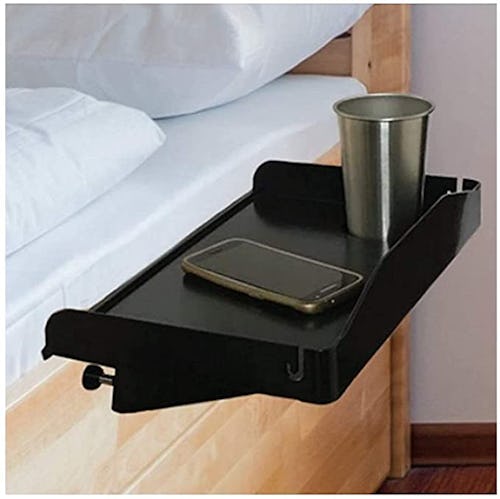 This bedside shelf is simple to install — hook it onto your bed frame, then twist the screws to attach it. It provides a handy spot for your phone, a book, a drink, or other items you want within reach and takes up minimal room compared to a traditional nightstand.