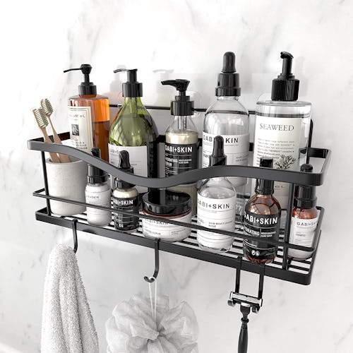Grab this pair of stainless steel shower caddies to hold all of your must-have products, including shampoo and conditioner, lotion, skincare, and more. There are also movable hooks for hanging items. Each caddy can support up to 20 pounds, and they’re held in place with adhesive hook strips.