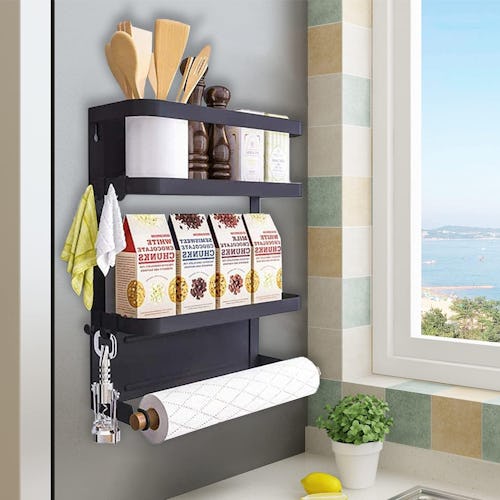 Short on storage in your kitchen? This metal rack can attach to your fridge or any other magnetic surfaces, and it has two shelves to organize items like spices, cans, snacks, and more. There is also a paper towel holder on the bottom, plus two movable hooks.