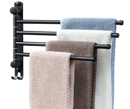 This well-designed towel rack will save space in your bathroom. It features four separate arms that swivel 180 degrees to spread out your towels for quicker drying. The arms can lay flat when not in use. The rack is made from rustproof stainless steel, and it can hold up to 31 pounds. It also comes in a silver finish in the listing.