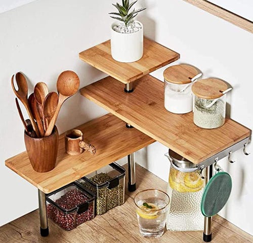 Position this corner shelf in the corner of any counter to take advantage of this often under-utilized space. It features three different-sized bamboo tiers (plus hanging hooks on the side), and the metal structure is lightweight yet stable.