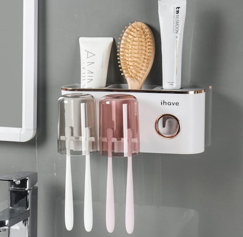 This toothbrush holder has spots to hang four toothbrushes, plus storage compartments on top for other items. There are also two magnetic cups on it for rinsing and a built-in toothpaste dispenser. It mounts on the wall using adhesive and can hold up to 13 pounds.
