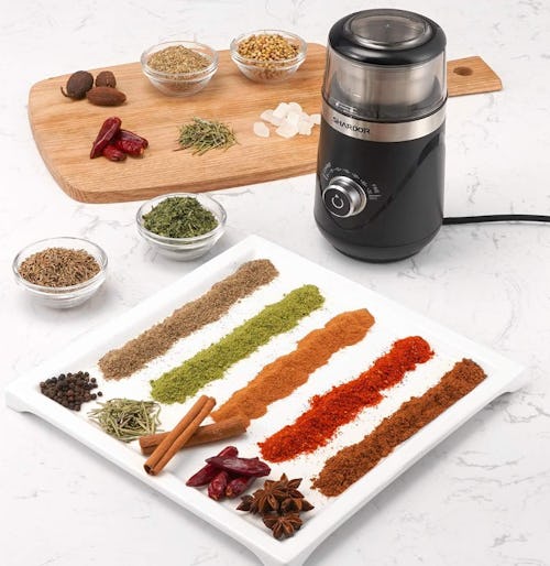Stick up to 2.5 ounces of coffee beans into this electric grinder, and it’ll grind them to your desired coarseness (ranging from fine to coarse) in seconds. With this, you’ll be able to make up to 10 cups of delicious coffee. The machine runs quietly, is mess-free, and can also grind other dry ingredients like spices.