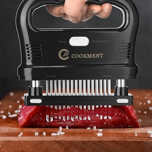 Got a tough cut of meat that you know will be chewy? Try using this tenderizer before you cook it. Dozens of sharp stainless steel blades pierce into meat, helping break up the tough sinews that create that chewy texture. Plus, it can also help marinades soak deeper into meat, cutting down on the amount of time that you need to let proteins marinate.