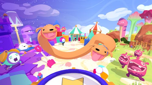 As a co-op experience, players have to consider how they’ll work in tandem to progress every step of the way. One platforming challenge will have them using their stretchy body and Herculean bite to coordinate a daring swing across a chasm. Next, you’re using your tubular body to repair a gardener’s broken hose. In the serene Sleep-themed world, players have to use the light of a miniature Moon to activate and deactivate platforms and lights. However, one player grabbing the moon means the light will shine through the other’s panting mouth.