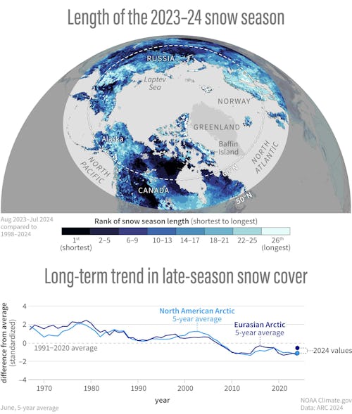 For example, some areas across North America and Eurasia experienced more winter snow than usual during the past year. Yet, the Canadian Arctic experienced the shortest snow season in the 26-year record. Early loss of winter snow can strain water resources and may exacerbate dry conditions that can add to fire danger.