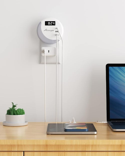 With six AC outlets, one USB-C port, and two USB-A fast charging ports, this outlet extender is a great alternative to a power strip. It will take up more room on the outlet, but it also has a tiny shelf attached to it that makes a convenient spot for placing devices you may be charging. It even has a little night light in the middle that can glow in different colors and offers adjustable brightness, making this the outlet extender that does it all.