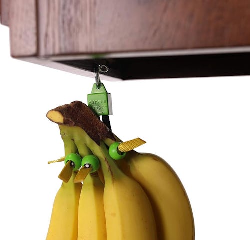 This ingenious banana holder frees up counter space and prevents over-ripening or bruising in the process. A built-in S-hook allows you to hang the bananas from underneath a cabinet or from an existing pot rack, for example, with the four short straps securely suspending the entire bunch. When not needed, simply store the holder away in a drawer.