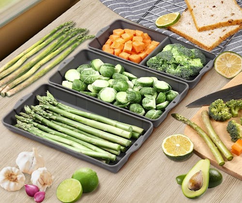 Getting meals on the table is no hassle when you have this comprehensive bakeware set, which includes an assortment of trays. Made of silicone that’s heat resistant to 450 degrees Fahrenheit, the sets are available in an assortment of designs and colors. One of the trays even has a divider so you can heat up two items at once while keeping them strictly separated.