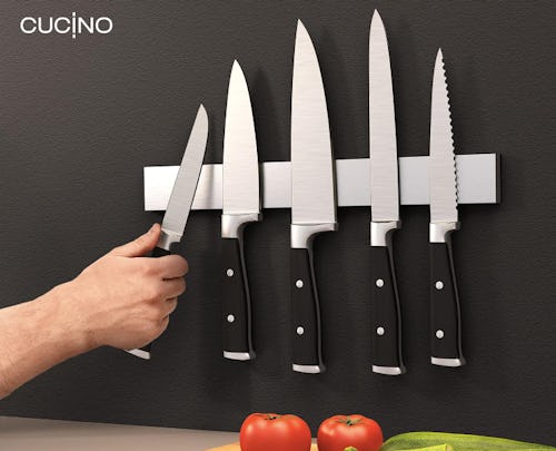 Clear up space on your counter or in your drawers with this magnetic knife holder. It’s not bulky like a knife block, yet it keeps your knives organized and accessible. It’s designed with strong magnets to keep multiple knives in various sizes securely in place. Plus, it’s really easy to mount on a wall — just peel and stick the adhesive backing.