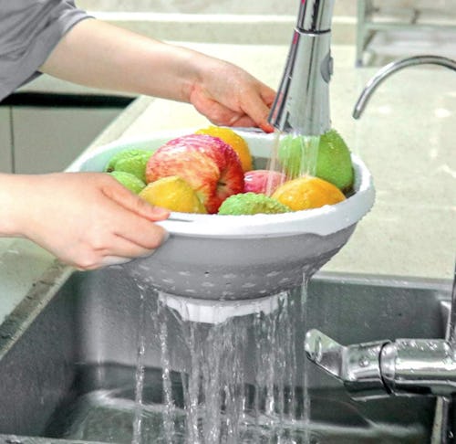 Its collapsible design makes this colander a breeze to store compared to others that are bulky and take up a lot of space. It features a built-in handle and a sturdy base so it can stand upright. It’s crafted from rubber and plastic that doesn’t harbor odor. It’s heat-resistant up to 302 degrees and is dishwasher-safe for easy cleaning.