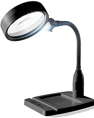 This desk magnifying glass is designed with a sturdy base so it can stand on its own on any flat surface. It has a flexible gooseneck so you can adjust the angle. It also has an LED light so you can see better. It’s perfect for crafts, sewing, making repairs, and more. Best of all, the stand is designed with a slot to hold your phone.