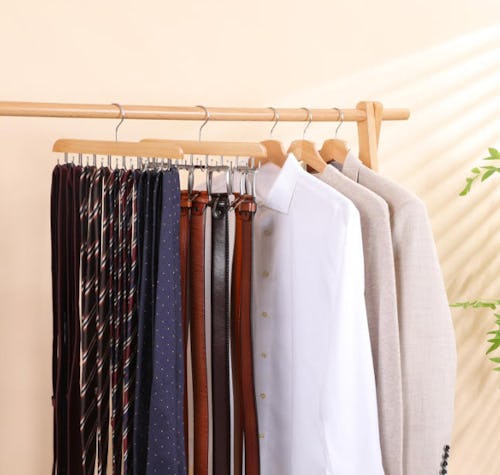 A set of wooden belt hangers that can neatly hold up to 48 belts