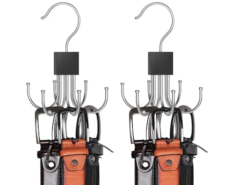 Maximize your closet space and keep belts from slipping and sliding off hangers with this two-piece belt organizer set that can hold up to 48 belts total. Each hanger features six rotating hooks that are perfect for easy access and tangle-free storage. The hangers are made from durable metal with a stylish wooden finish.