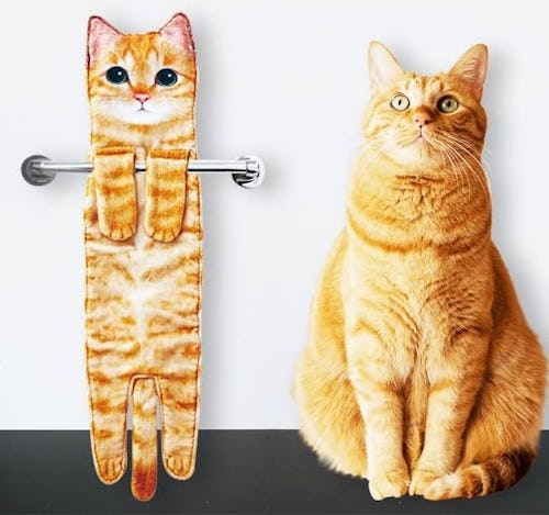 A must-have for any feline appreciator, this cat-inspired hand towel features a lifelike silhouette and coloring to add quirk to any towel rod. Soft and absorbent, its realistic design is complete with head, paws, and tail, while a snap button keeps it in place on any rack. Choose from more than 30 styles that mimic everything from a tortie to a Siamese.